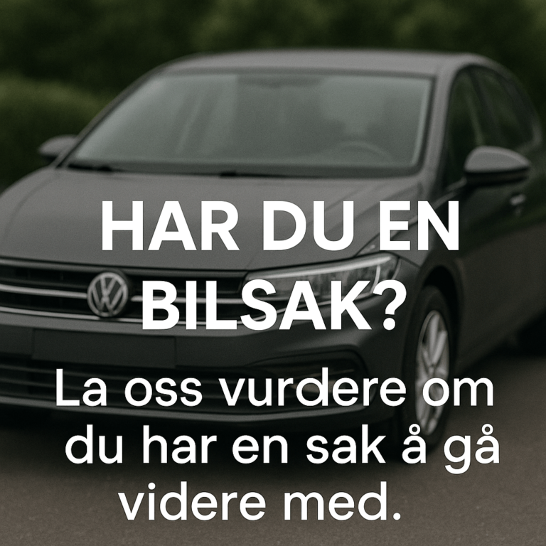 Vi har ekspertise på bilsaker. I løpet av kort tid vil vi ofte se om du kan ha en sak å gå videre med. Vi tilbyr en gratis og uforpliktende vurdering, så blir det opp til deg hva du vil gjøre videre i din sak.